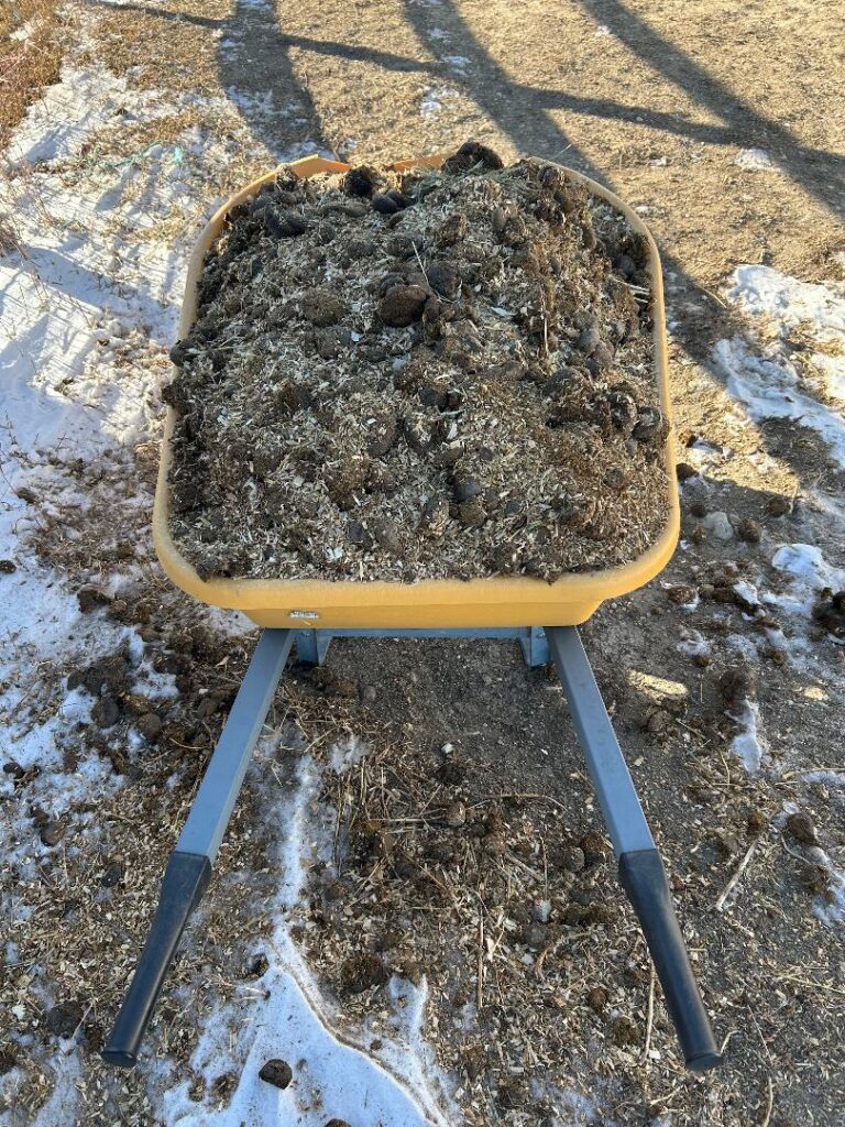 understandably choose to shit in the barn. I can’t leave those mule muffin piles sitting around because that is also where the mules sleep. The barn is like a giant cat litter box filled with soft wood shavings (Thanks Doc Clarence). Indeed, the arid NoCo air usually dries the mule muffins out in a few hours, like cat turds. But the wood shavings need to be regularly filtered by hand with a multi-prong pitchfork and the scooped mule muffins moved to a wheelbarrow, which is then wheeled out back to Hadrian’s Wall for creeping decomposition.
