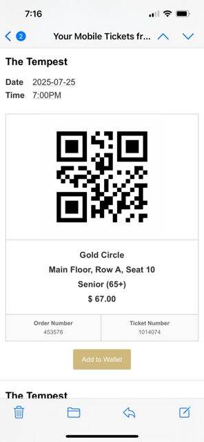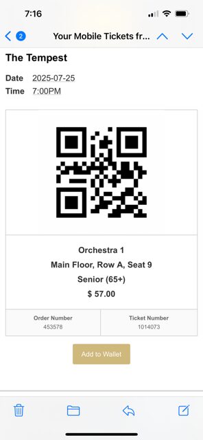 Lisa gets the Gold Circle seat (nothing too good for my better half), I, the Orchestra (right beside her), and yes, I got the Senior Discount!