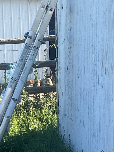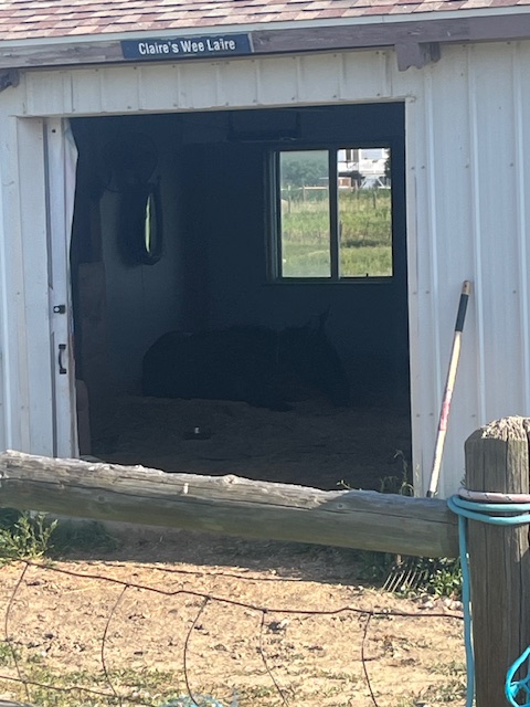 First among equals is checking on Claire, like yesterday, during the height of a very hot sun, I didn’t see her grazing in her usual spots and so went to check the barn, where I found her comfortably lounging in the cooler shade, directly in the path of the wall and ceiling fans.