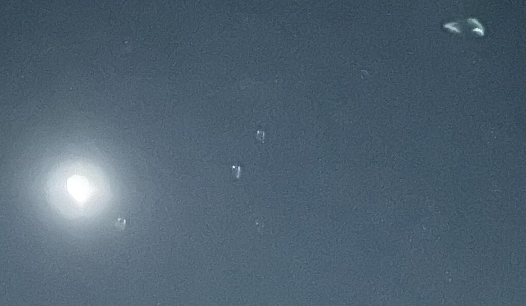 In the second shot, there are those three matching stars, but now nothing where the anomaly was in the first shot. That anomaly has now moved to the left in the second shot, quite a distance through the sky in the nanosecond that passed between photos, and now appears in a spot – about 12 o’clock over the moon, that was clear in the first shot.