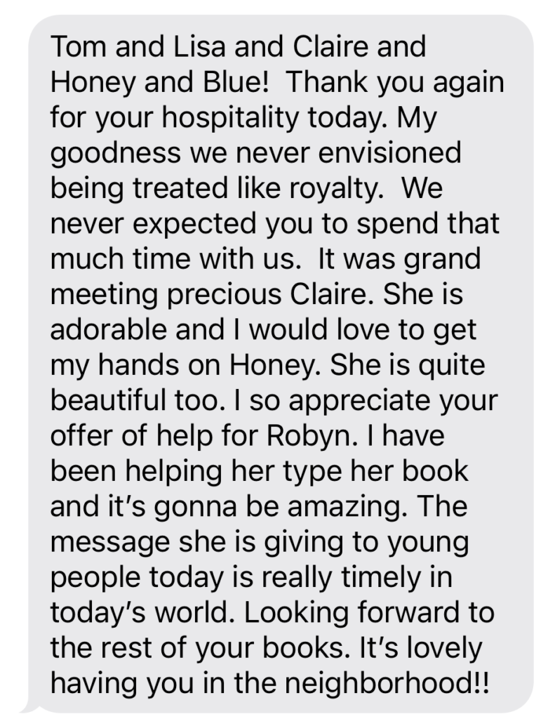 I told her that the coincidence was amazing and made the book even more special to me because she rehabilitated it the same way Tom had been rehabbed at Lisa’s rehab center.