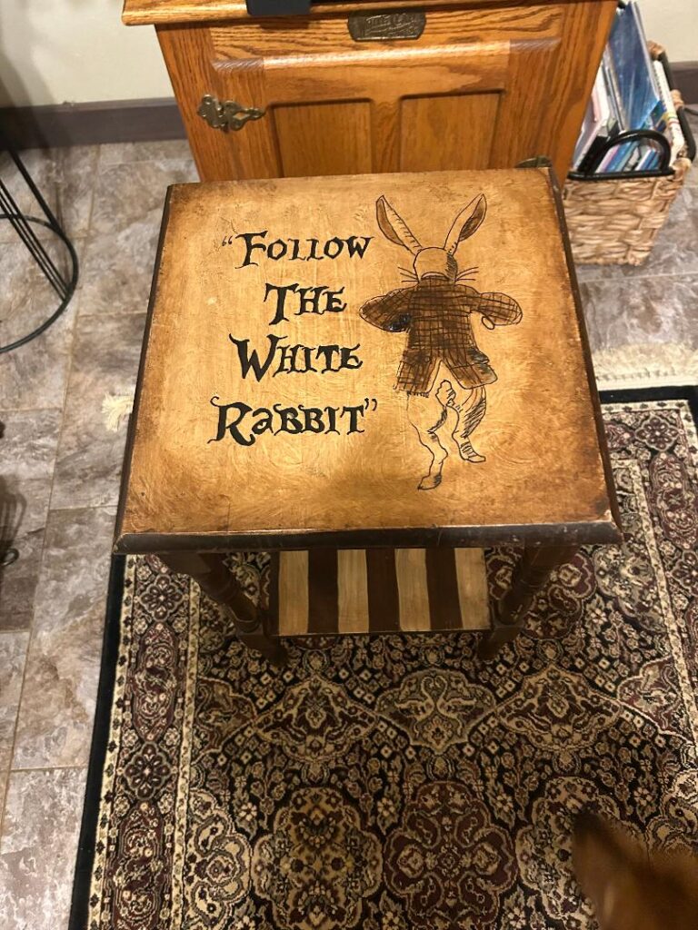 So, yesterday, while doomscrolling FB local sales, I came across a wonderful piece that would be perfect for Scarlett, Savanna and Stella. It invokes that wonderful white rabbit that has changed so many lives.