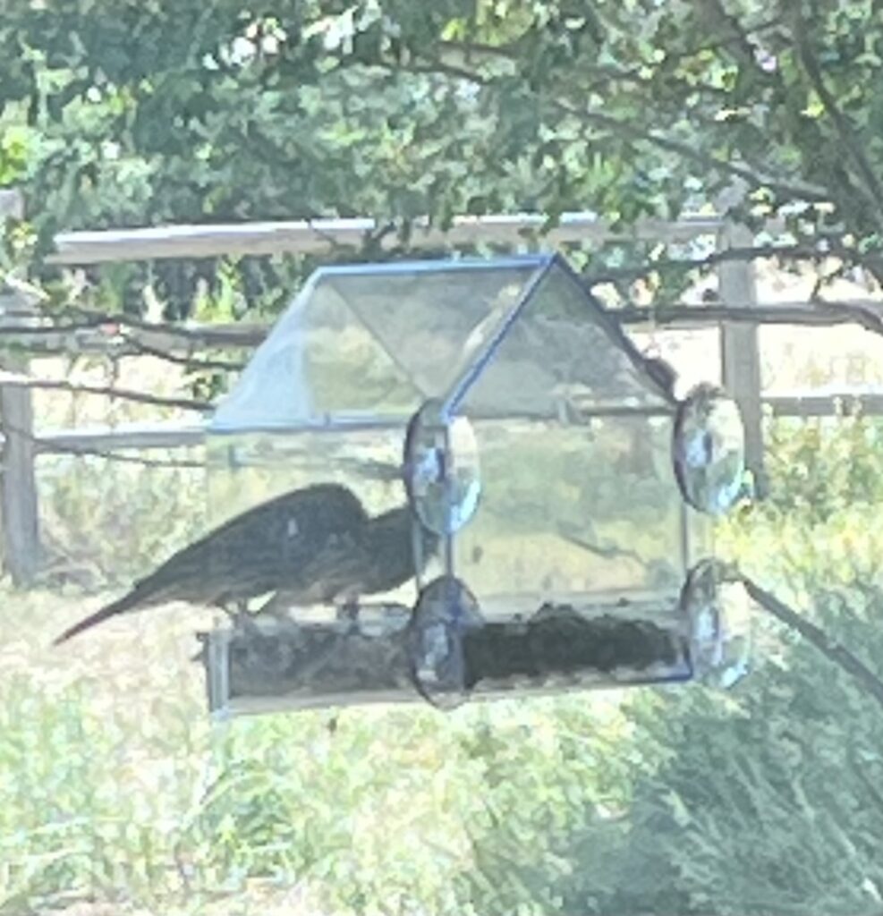 and a bonded pair of sparrows who enjoyed a late afternoon snack in the shade cover of Lisa’s bird feeder on the front window.