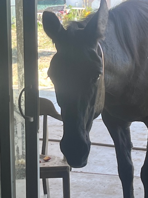I leave that door open because otherwise Claire bangs on the glass with her massive front hoof, like Quasimodo’s bells in Notre Dame, sending the Beagles into a barking frenzy. It sounds like the Walls of Jericho are about to come down. As a result, the door stays open and my summer air conditioning bill is triple what it normally would be. But Claire is worth it.