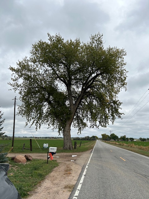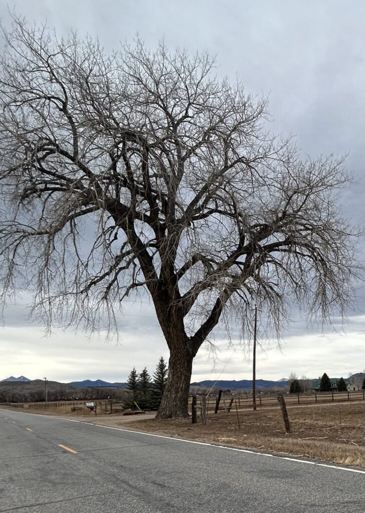 But there is one particular tree in the area that always calls to me when I’m passing on the road going to-and-from Longmont. I always feel sympathy/empathy for this amazing tree that stands, alone, surrounded only by hay fields. It has to be hundreds of years old just by its size. I’m certain that when it was a sprout, it was surrounded by others of its kind, in a NoCo forest. I’ve stopped my car many times and gotten out just to hug this particular tree.