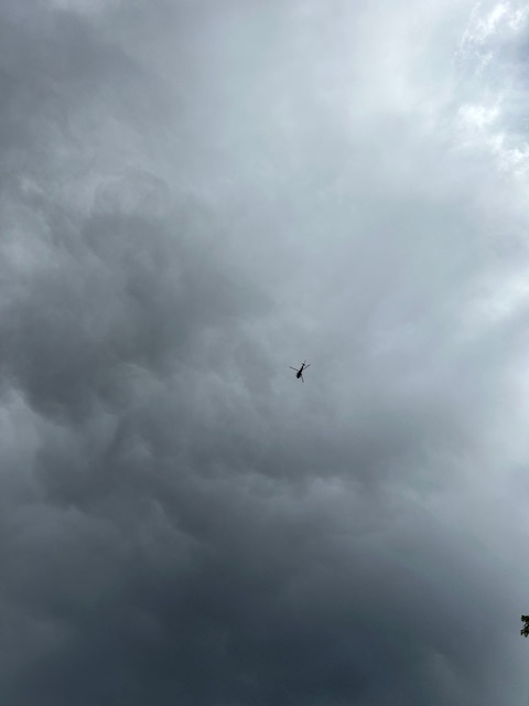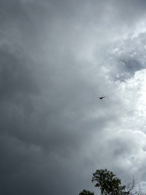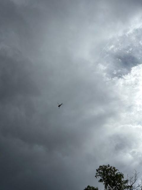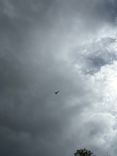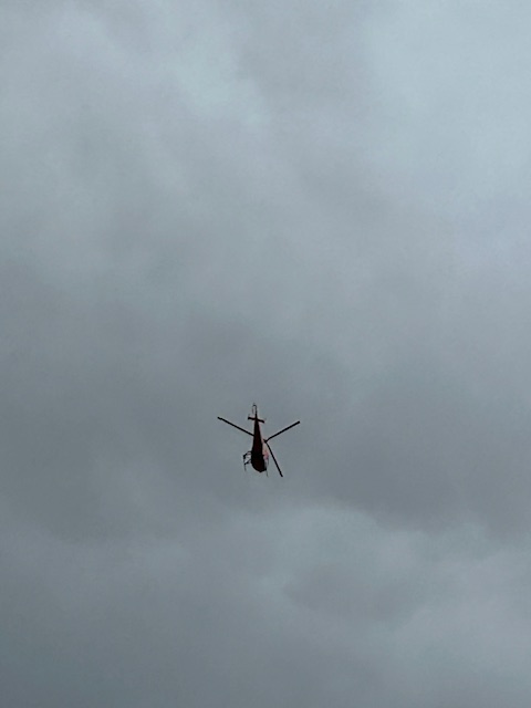 Anyway, while I was out there toiling in my garden, I heard the distinct and rare sound of a chopper over head. I walked out to my drive and started watching it as it passed in three circles over Casa Claire. When I realized it was hanging around for more than a flyover, I waved and then started snapping photos.