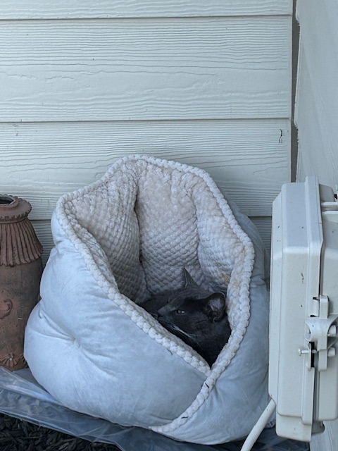 Since it is beautiful Fall weather here in NoCo, and the cats only use their indestructible heated bunkers at night, I placed a couple of fluffy cat beds in distant corners of the JTS Grotto for the cats to curl up in during the daylight hours. One such bed, tucked around in a corner under an eave just outside Lisa’s office, has become an afternoon haven for Smokey the cat.