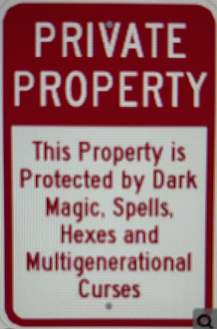 And just to show you that an evolved male can multi-task, while the legal band played on, I managed to create and purchase my latest Private Property Sign for the front fence to whimsically warn all intruders that should they manage to avoid the more common and patent threats of patrolling Mules and Dogs, and our free exercise of Second Amendment rights, there remains a final layer of inescapable and eternal bad juju that await the uninvited.