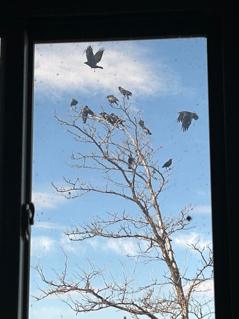 Yesterday, along with burning through a bunch of streaming CLE videos – 15 hours completed over the past two days, 9 hours to go – I was excited to look out the window while clearing out the dryer in my laundry room to see my murder of crows descending on my backyard