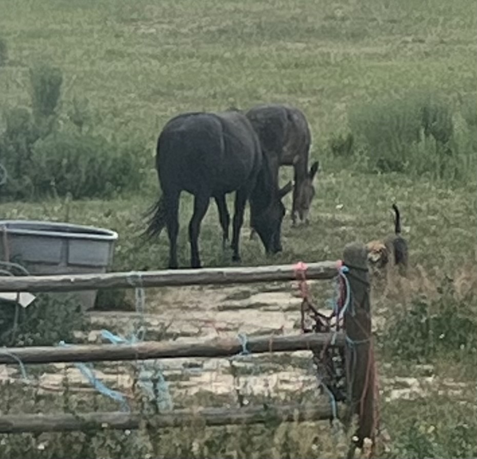 But God knows that there is no rest for the wicked, so I still had to unload and move the 8 bags of wood shavings from the back of the waiting Toyota – yes, from TCS series – down to the barn at the height of the heat, which did not seem to be bothering mules or dogs.