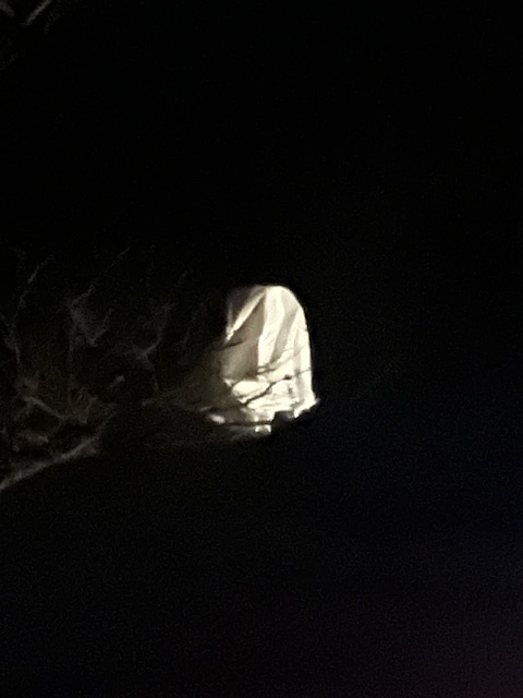 And, a few hours later, when I finally peaked out my bedroom for one last supervisory gaze around the property before I retired for the night, I spotted one of the Charlie Brown’s Halloween Characters floating in the branches of one of the trees.