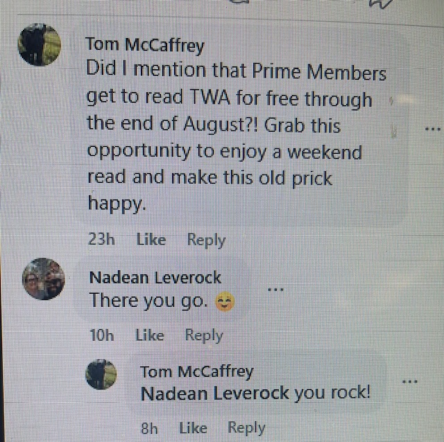 Well, yesterday all of my bedevilment paid off. After killing myself cleaning the basement (more later), before I went to bed, I dragged this old and tired body to my office and checked my FB page. There was a post to my post, from Nadean.
