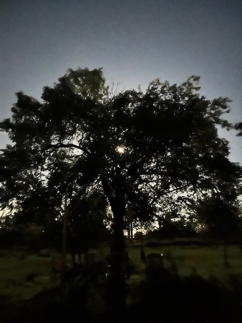 which were still burning brightly in the early morning while the Strawberry Moon passed over their sleeping heads.