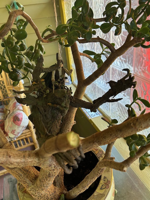 We shared some biographical background – which included a common love for JRR Tolkien – that is reflected on her part in the fact that she has a model of the Ent, Treebeard, with a sword brandishing Frodo standing on his shoulders, buried in that very cool plant behind the lamp in the photo.