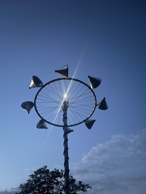 Spotting the waning half moon through my favorite whirligig triggered all of these thoughts this morning. The rotating wheel is a metaphor for life, the moon representing the magic of what lies beyond our existing senses, and our earth, and for that captured moment, I am creatively thankful.