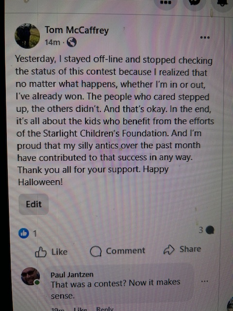 I then I realized, I didn’t care what happened. It started as a lark, and I had some fun. A formula that has repeatedly produced the postive out come of another story in my life. And it helped the Starlight Children’s Foundation. A win-win.