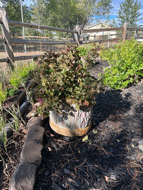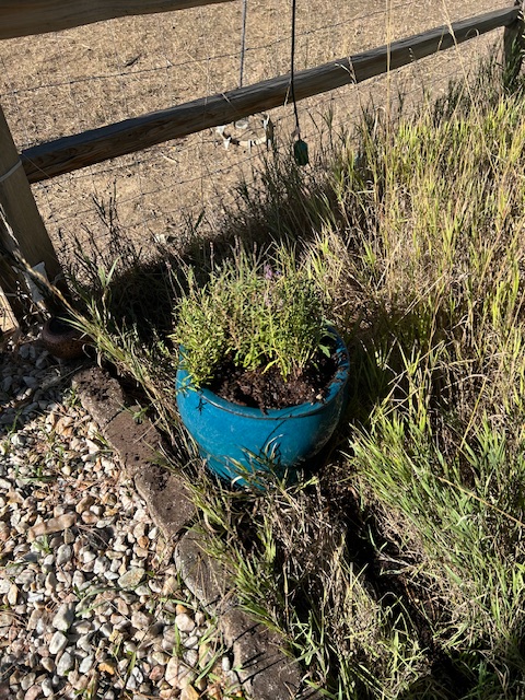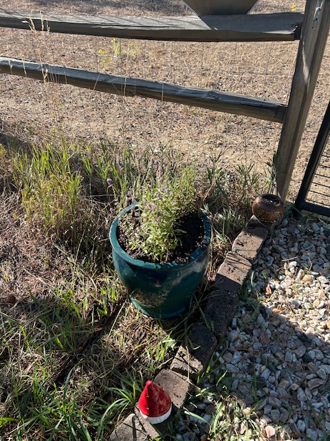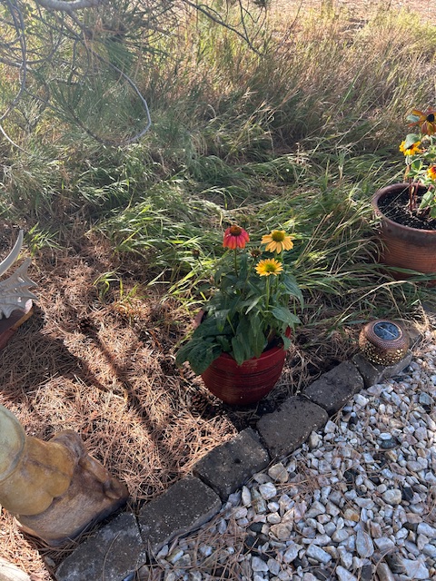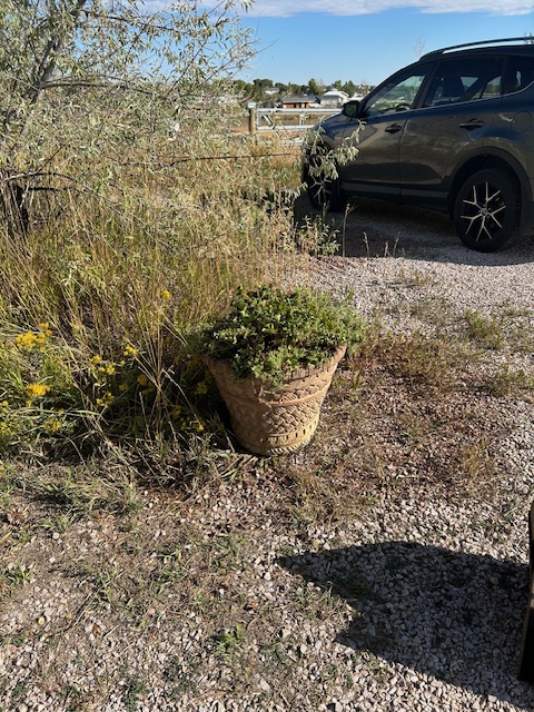 For example, the main three flowers/plants (I cannot tell you what they are – Lisa bought them) had to be shifted from their large, nice, ceramic pots, into three of the same painted planter pots Lisa selected from our Sculptor Guy Josh’s place in Boulder. Fair enough.