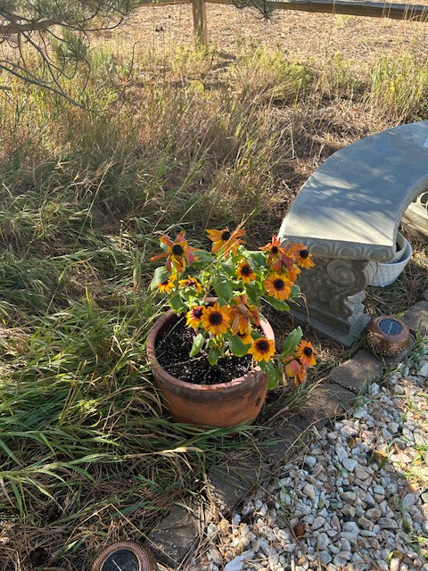 Now, I had a long plastic boat of various vine based flowers (maybe morning glories) – the only one of the three to survive the summer – that really needed a new home. Lisa had purchased a huge concrete planter when we first moved here and made me place it in the back yard. Unfortunately, Claire loved every flower we planted in it, so for the last three years it has sat fallow like a large paperweight taking up a corner of the concrete patio. So, a week or so ago, I humped that heavy planter on my handy hand truck up the hill of the side paddock and out to the driveway, where it now functions as the new home for my viny plant as the flora Walmart greeter to any visitor to Casa Claire.